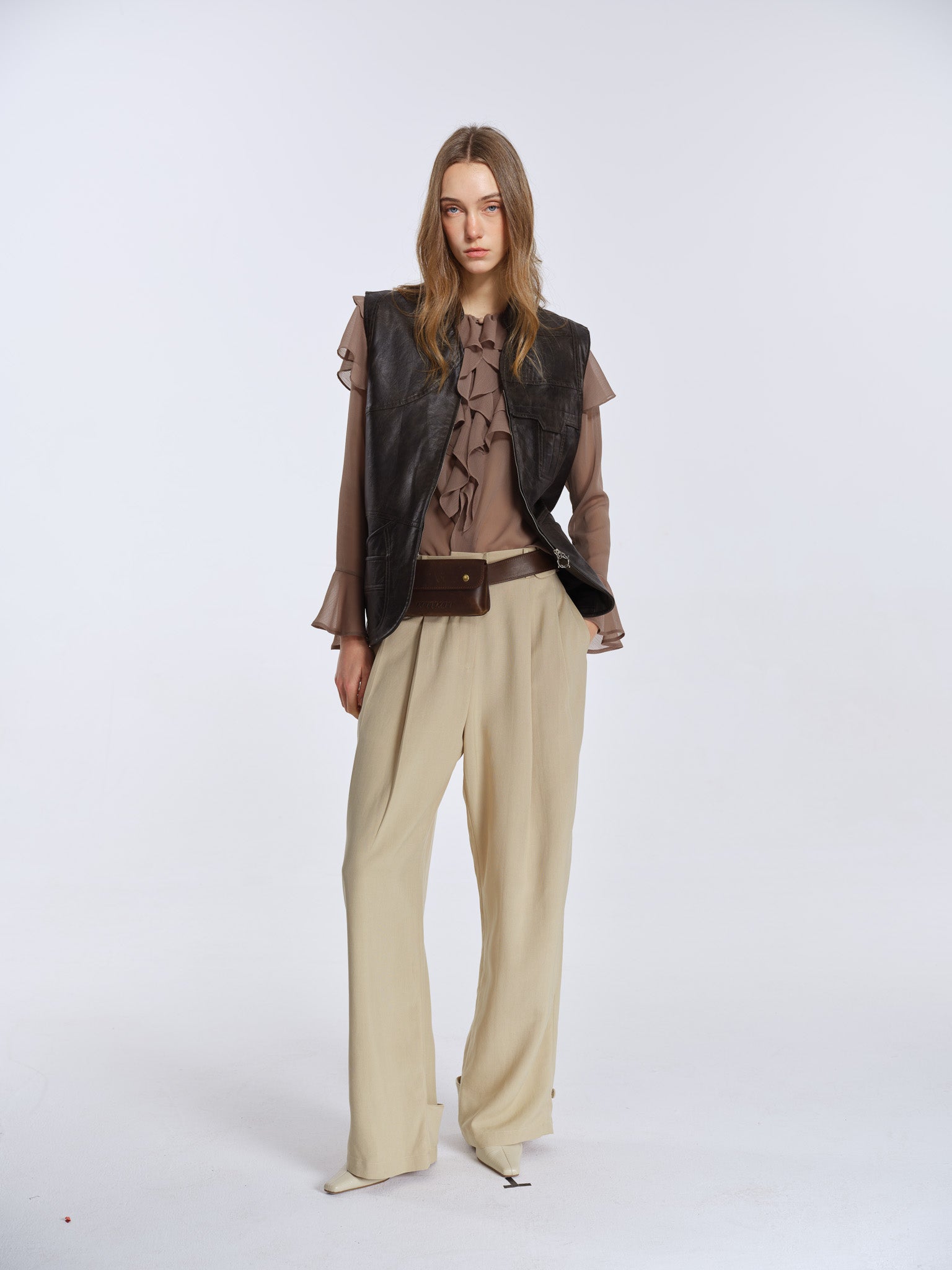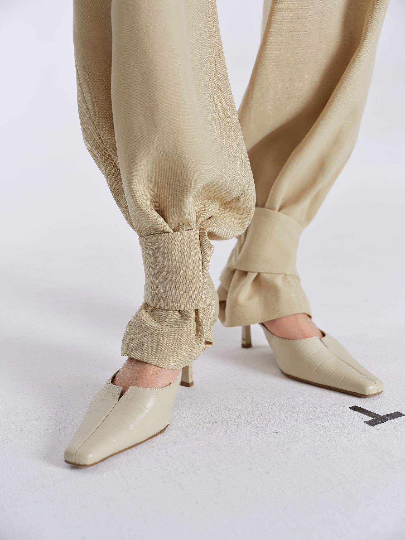 The Finn shifts with you — structured when you need clarity, relaxed when you want ease. Drawing from 1940s Gurkha trousers and softened through a ’70s Japanese utility lens, her high waist and double pleats shape the waist with intention. An adjustable cuff lets the leg fall straight or taper in, while the softly wide silhouette keeps movement fluid, never rigid.