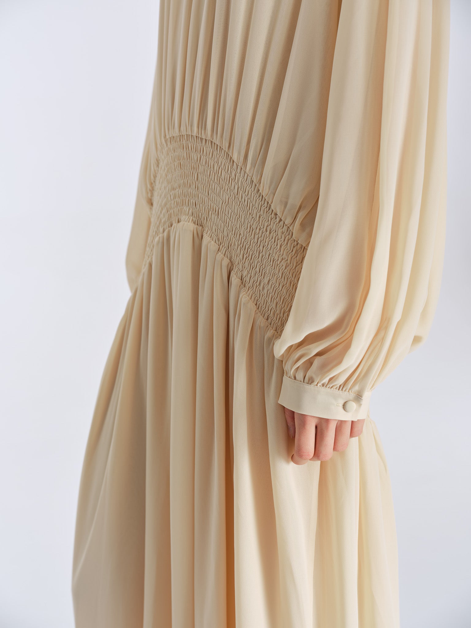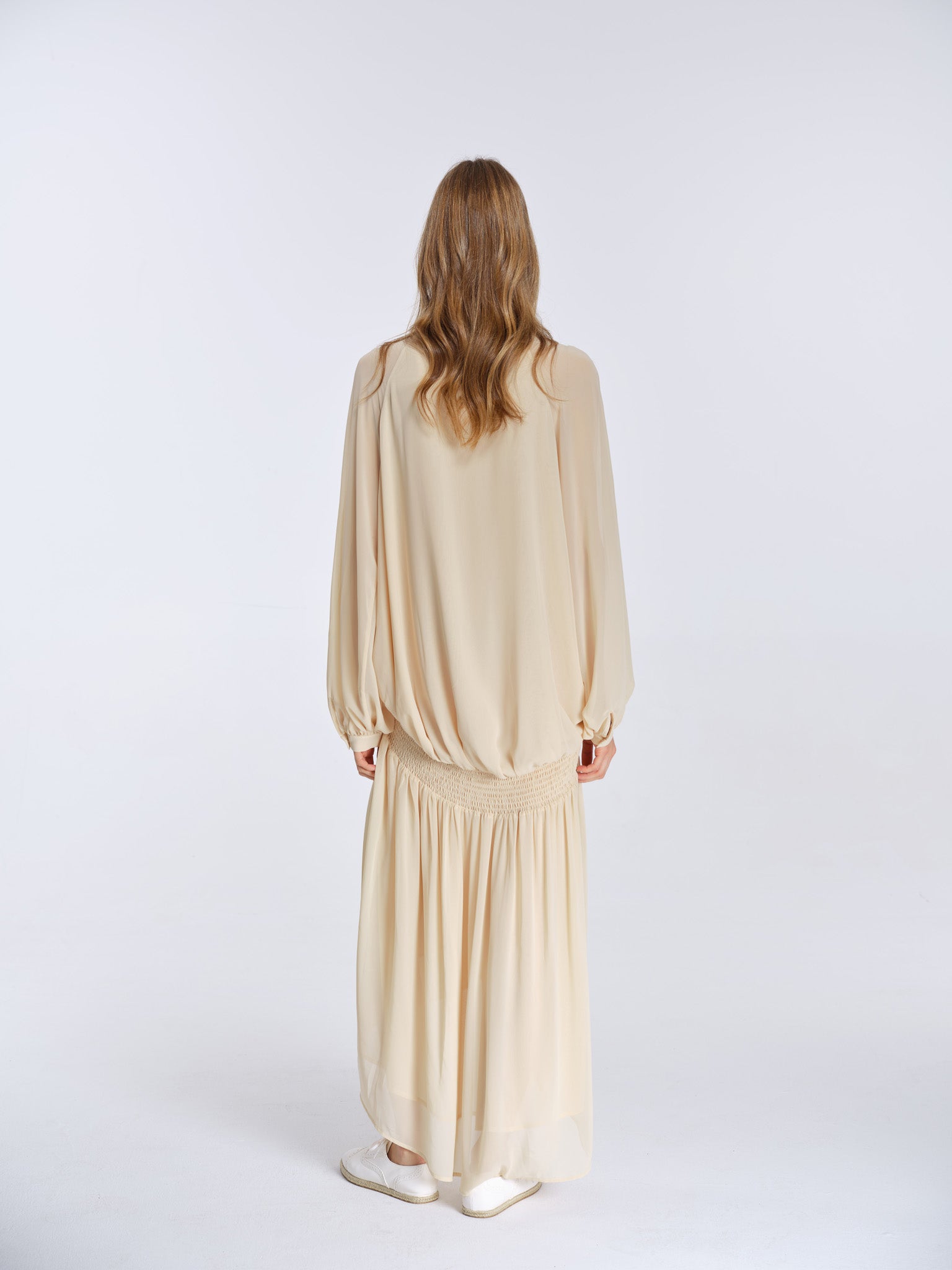Not just a smocked dress — Siena softens structure into something sunlit and free. Inspired by the relaxed elegance of Mediterranean women in the ’70s, her low-waist smocking gathers gently, shaping the body without holding it tight. The skirt falls freely with each step, balanced by a V-neck and loose sleeves that feel light but grounded. Siena is ease, worn with intention — quiet, fluid, and unmistakably present.